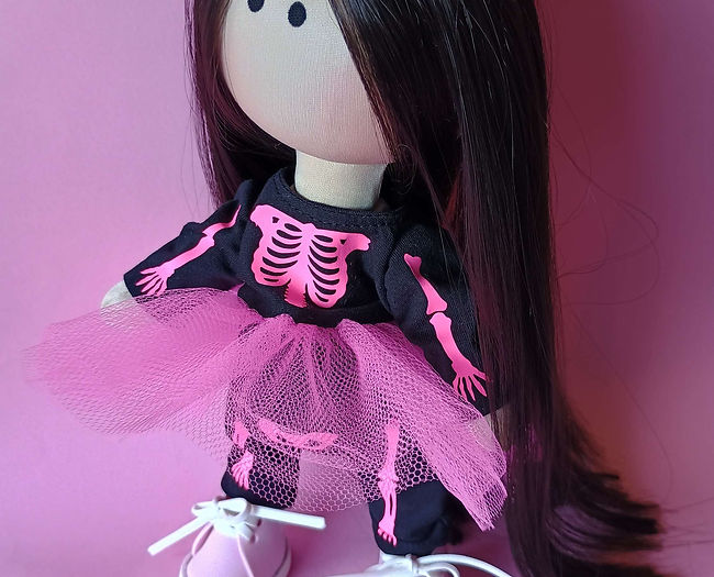 Con mi disfraz en dos piezas de esqueleto pantaloncito y buzo con detalles en rosa neon con tutú, estoy lista para una fiesta de disfraces.